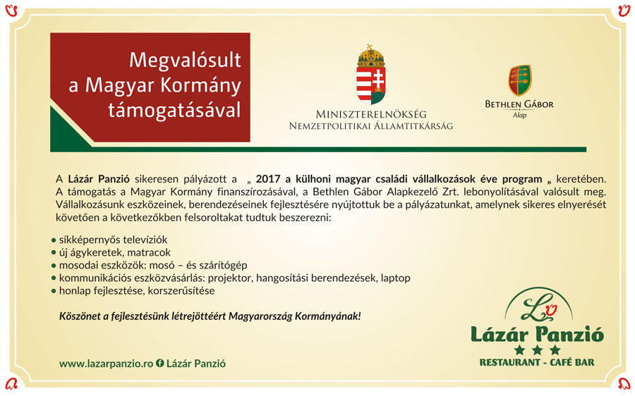 Gyergyószentmiklós központjában, mégis annak zajától mentes helyen található a Lázár Panzió, mely egyben szálloda, étterem, vendéglő és kávézó. Számunkra ez a hely kellemes emléket és tradíciót jelent. Ezen a helyen egyik ősünk, néhai Kastal Miklós már az 1930 években vendéglőt tartott fenn. Az 1960 évek végén itt nyitották szüleink, illetve nagyszüleink Kiss Árpádék Gyergyószentmiklós egyetlen családi panzióját. A hagyomány szellemeben, újraindítottunk egy családias jellegű panziót, ahol egyágyas, kétágyas és háromágyas szobák, illetve 2 igényes lakosztály (apartman) kényelmes és kulturált pihenést biztosítják a kedves vendégeinknek. Mindehhez reggel 8-tól éjfélig nyitva tartó (50 férőhelyes) vendéglő, valamint 7-22 óráig nyitva tartó (80 férőhelyes) kávézó és tágas nyárikert tartozik. Fogadónkból telefonos és internetes kapcsolatot lehet létesíteni a világ bármelyik pontjával. Fogadások, rendezvények, konferenciák ideális színhelye. Autókölcsönzési lehetőséggel állunk vendégeink rendelkezésére. |
